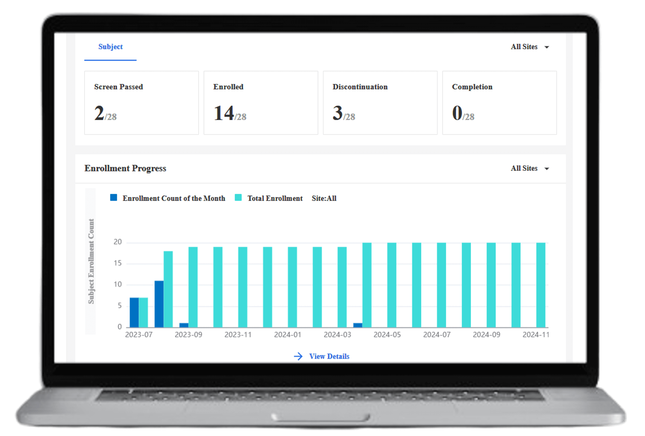 Multi-dimensional reports on subject data, enrollment progress, trial supply inventory, and item details for complete project oversight